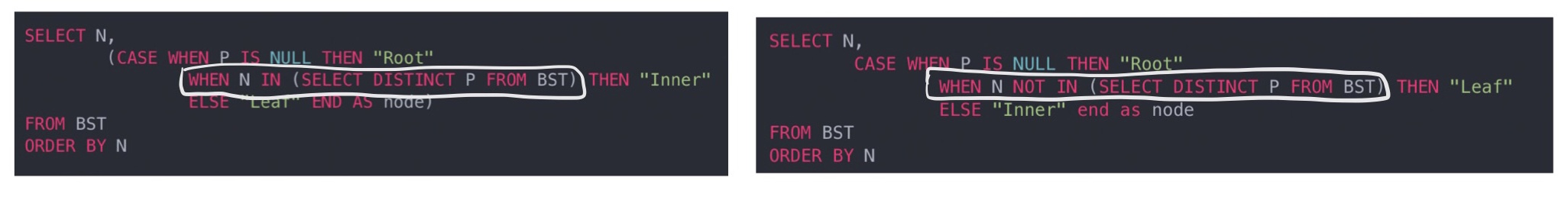 볼 때는 별 차이가 없어보이지만 NOT IN으로 하는 경우 결과값이 제대로 나오지 않는다. LEAF로 적용되어야 하는 경우에도 INNER로 처리된다. N과 (SELECT DISTINCT P FROM BST)의 값을 비교하는 과정에서 NULL값 때문에 오류가 난다. (SELECT DISTINCT P FROM BST)의 결과값이 NULL, 2, 4 가 있다고 생각해보자. 그럼 N != NULL, N != 2, N != 4 부분을 모두 통과해야 제대로 LEAF로 결과가 나올 것이다. 그런데 N != NULL 부분에서 오류가 난다. NULL은 값이 없기때문에, 스칼라 연산자인 != 를 수행할 수 없기 때문이다. N!= NULL의 결과값은 FASLE, TRUE 도 아닌 Unknown 으로 나오므로 N이 조건을 만족하지 못해 INNER 값이 나오게 된다.