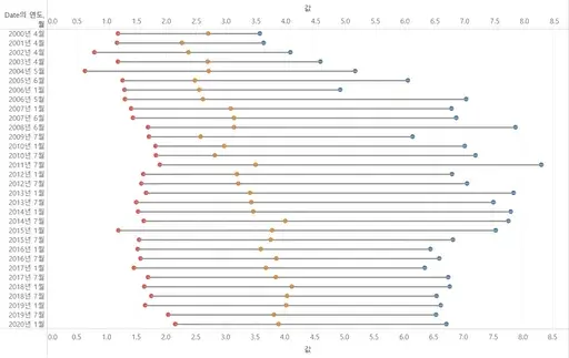 예를 들어 멤버십 고객과 비멤버십 고객의 매출 차이를 보여줄 때 사용하면 유용하다. 거기에 우리 회사가 타깃으로 하는 고객의 매출을 기준으로 비교하고 싶다면 위 그래프와 같이 3개의 점을 이용해 그리면 직관적일 듯하다.