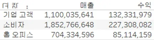 고객 분류에 따른 매출, 수익을 함께 본다 해보자. 그렇다면 우리는 '고객 분류'를 행에 두고 열에 '매출', '수익'을 올려둘 것이다.