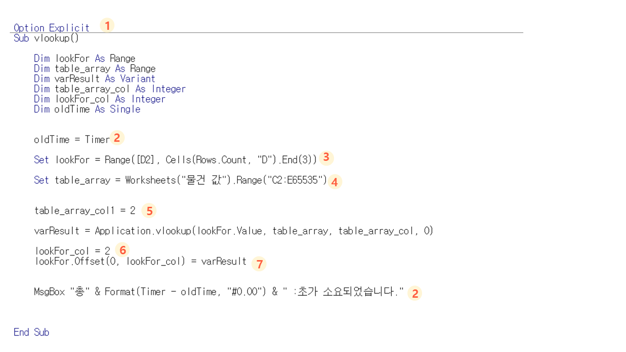 MsgBox "총" & Format(Timer - oldTime, "#0.00") & " : 초가 소요되었습니다."