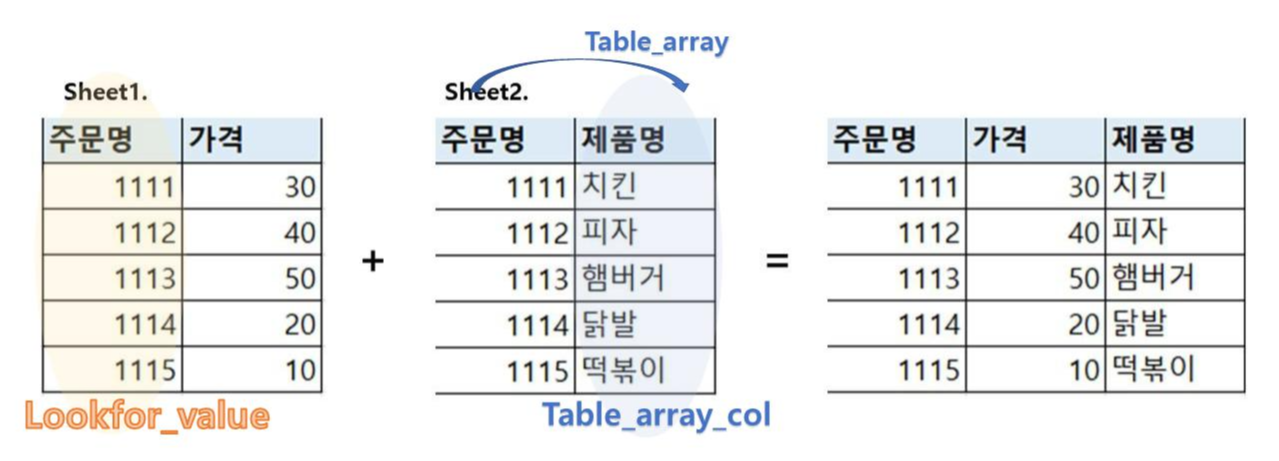Sheet1에 있는 주문명과 일치하는 sheet2에 있는 제품명을 가져와서 맨 오른쪽과 같은 결과물을 내는 것이다.
